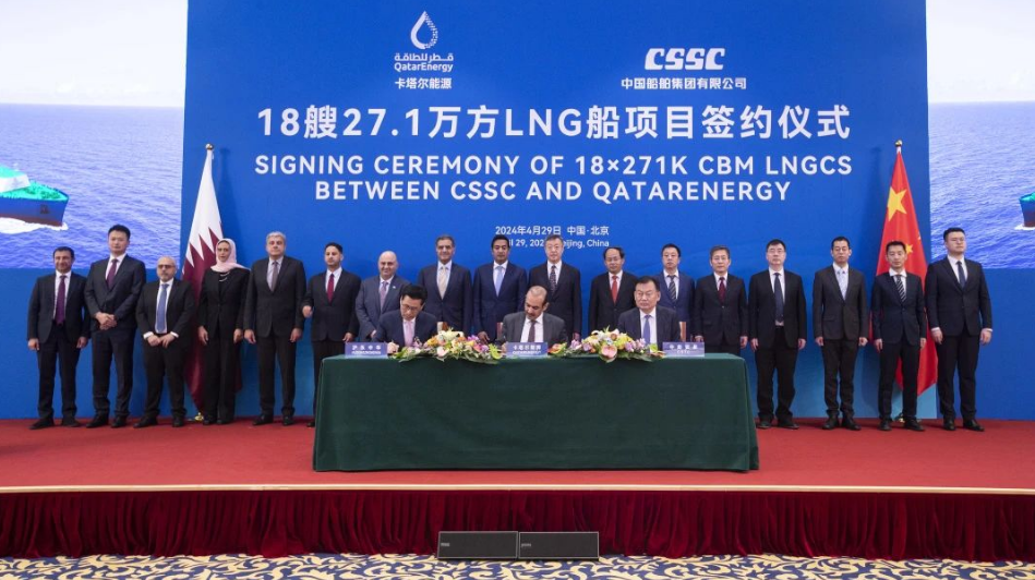 4月29日,中國船舶集團有限公司與卡塔爾能源在京舉行18艘全球最大27.1萬立方米超大型液化天然氣(LNG)運輸船項目簽約儀式。工業(yè)和信息化部副部長單忠德,外交部西亞北非司大使呂健,中國船舶集團董事長溫剛、副總經理盛紀綱,卡塔爾能源事務國務大臣、卡塔爾能源總裁兼首席執(zhí)行官薩阿德·謝里達·阿爾卡比,卡塔爾能源天然氣首席執(zhí)行官卡利德·阿爾-塞尼,卡塔爾能源商務和業(yè)務發(fā)展執(zhí)行副總裁賈西姆·阿爾馬拉祖齊等領導和嘉賓出席簽約儀式。