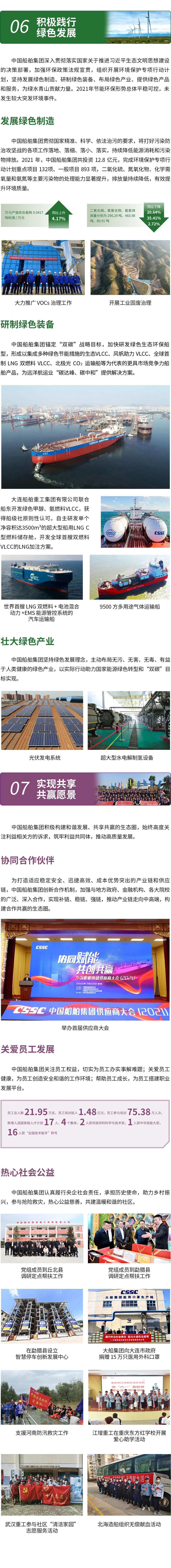 《報(bào)告》緊扣2021年國家經(jīng)濟(jì)社會發(fā)展重要事件,從“強(qiáng)化企業(yè)創(chuàng)新主體地位,打造國家戰(zhàn)略科技力量”責(zé)任專題講述了中國船舶集團(tuán)履行公眾責(zé)任,助力經(jīng)濟(jì)社會高質(zhì)量發(fā)展、可持續(xù)發(fā)展的故事。從“弘揚(yáng)偉大建黨精神”“堅(jiān)定不移履行強(qiáng)軍首責(zé)”“持之以恒壯大主業(yè)實(shí)業(yè)”“加快高水平科技自立自強(qiáng)”“深化改革、強(qiáng)化管理”“積極踐行綠色發(fā)展”“實(shí)現(xiàn)共享共贏愿景”七個方面全方位展示了中國船舶集團(tuán)履行軍工央企政治責(zé)任、經(jīng)濟(jì)責(zé)任、環(huán)境責(zé)任、伙伴責(zé)任的履責(zé)形象和履責(zé)績效。