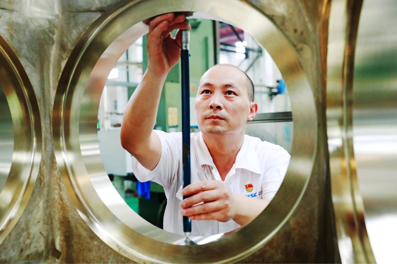在武漢船機平臺生產現場,一名機床操作師傅,正在對加工后的零件進行檢測,專注的表情展現了船舶人嚴把質量關,人品以誠心為本,企品以恒心為要,產品以匠心為重的精神風貌。