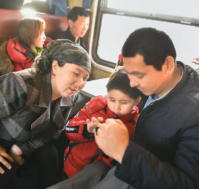 11月25日,在新疆塔克拉瑪干沙漠西南緣的喀什-和田對開火車“和田玉龍?zhí)枴鄙希每蛡冋谛菹ⅰ#ㄚw 戈 攝)