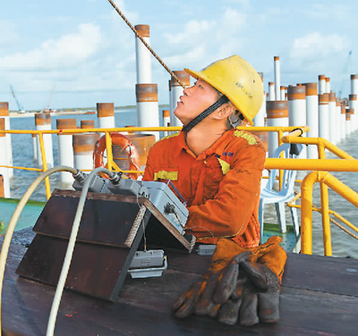 7月30日,在肯尼亞拉穆港,工作人員在中國交建“粵工樁11號”施工船上工作。(陳 誠 攝)