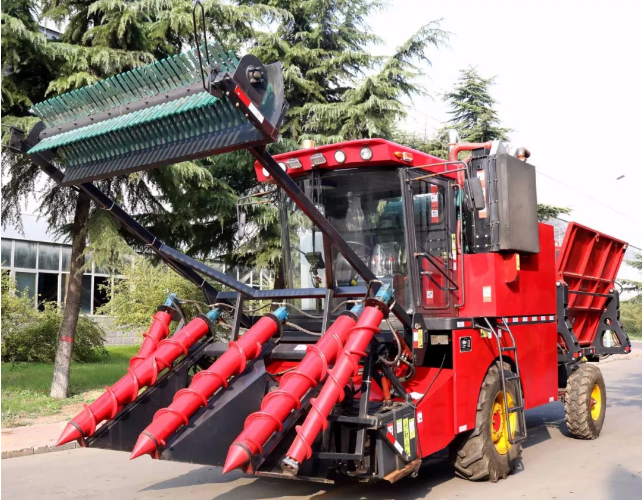 該大型農(nóng)機設備,可收割田地坡度小于5°,種植壟距1. 1~1.2米的甘蔗,能同時完成甘蔗的扶正、分蔗、切梢、跟切、喂入、輸送、除雜和集料轉(zhuǎn)運等作業(yè),不需要輔助工具,一次收割兩行,收割效率高。采用整桿式收割模式,有效解決了切斷式甘蔗存儲時間短的問題。獨特的切刀智能仿形系統(tǒng),使甘蔗跟切喂入更順暢,減小蔗徑損失率,且宿根切口平整,保證甘蔗來年發(fā)芽率。