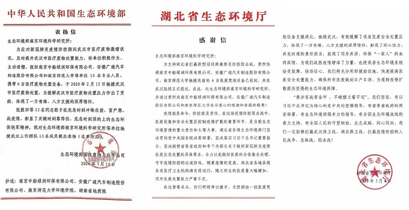 ????近日,國家生態環境部、湖北省生態環境廳分別發出表揚信和感謝信,對中國船舶集團所屬中船綠洲等在疫情防控期間作出貢獻的單位給予高度贊揚,表示衷心的感謝,并對包含中船綠洲旗下環保公司陳紀賽、陳良義、王小峰、周浩在內的13名生態環境“鐵軍”提出表揚。