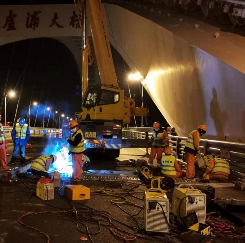 ????此時,來自中國船舶集團(tuán)所屬上海盧浦大橋投資發(fā)展有限公司的守橋人開工了。近20平方米的施工區(qū)域,人頭攢動、焊花飛舞,工人身著的安全背心泛出的熒光,焊槍下閃爍的弧光和橋面的燈光交相輝映。