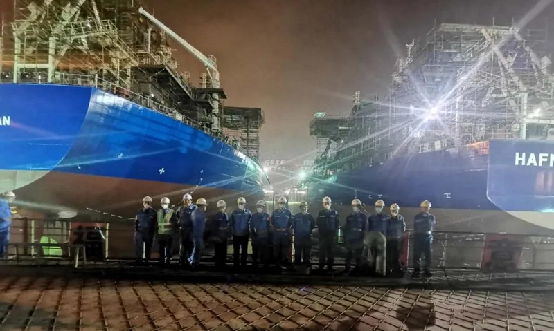 ????進塢后,兩艘船將進行主船體搭載包括主要設備吊裝、各系統完整及艙室報驗等工作,為吊裝、拼接、合攏做準備。