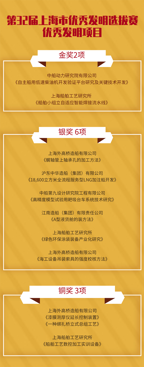 中國船舶集團上海船舶系統(tǒng)共19項職工創(chuàng)新成果,在第32屆上海市優(yōu)秀發(fā)明選拔賽等各項賽事中斬獲佳績。