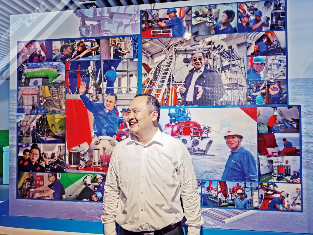 國企開放日期間, “奮斗者”號總設(shè)計(jì)師葉聰帶領(lǐng)眾多央媒記者走進(jìn)中國船舶、深入船人一線,感受大國重器的張力!在展覽室的背景墻前,他縱然一笑,撒下江湖傳說。
