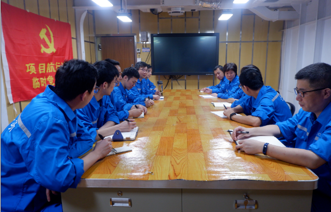 毛獻群在艦上同項目組成員一起討論技術問題