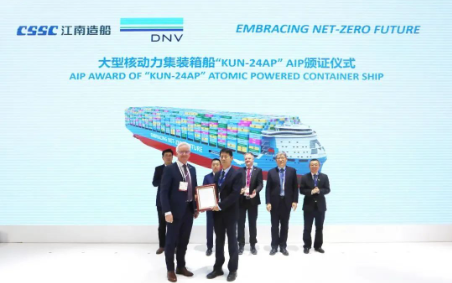 全球首型、世界最大24000箱核動力集裝箱船船型發布,挪威船級社(DNV)頒發了該船型的原則性認可證書。