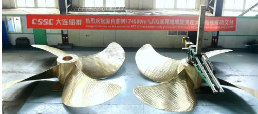 大連公司下屬大連船推成功交付自主開發設計制造的17.4萬立方米LNG運輸船雙尾鰭螺旋槳。
