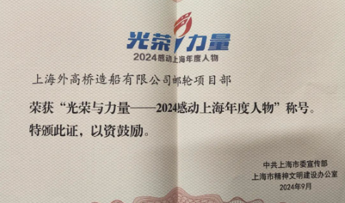 “光榮與力量——2024感動上海年度人物推選活動”獲獎名單日前揭曉。中國船舶集團(tuán)外高橋造船郵輪項(xiàng)目部獲評“2024感動上海年度人物”。本次活動以2023年8月至2024年7月中,上海市涌現(xiàn)的事跡突出、精神可嘉、社會認(rèn)可的模范人物和先進(jìn)集體為推選對象,通過175萬市民網(wǎng)絡(luò)投票和專家評審?fù)七x出先進(jìn)典型。