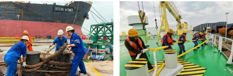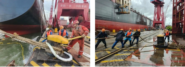 臺風(fēng)來臨前,聞“風(fēng)”而動。緊急為單船加纜,將水上設(shè)備移入港池避風(fēng),拆除全部應(yīng)急梯,對纜樁開展地毯式排查,預(yù)先部署防臺橫纜,筑牢前置防線。針對受風(fēng)面積大的大型集裝箱船等重點(diǎn)產(chǎn)品,升級加固措施,加裝高強(qiáng)度纜繩等,為巨輪系緊“安全鎖”。