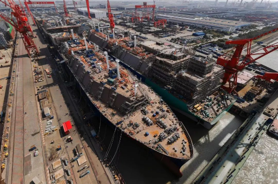 近日,在中船長(zhǎng)興造船基地中國船舶集團(tuán)旗下滬東中華2號(hào)船塢,首次呈現(xiàn)了4艘174000立方米大型液化天然氣(LNG)運(yùn)輸船同塢建造,其中2艘同日出塢、2艘半船起浮的盛景。
