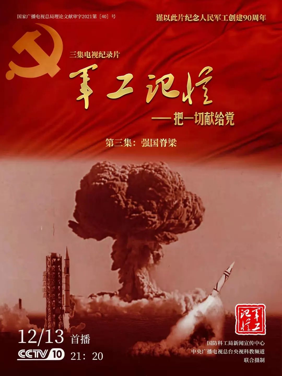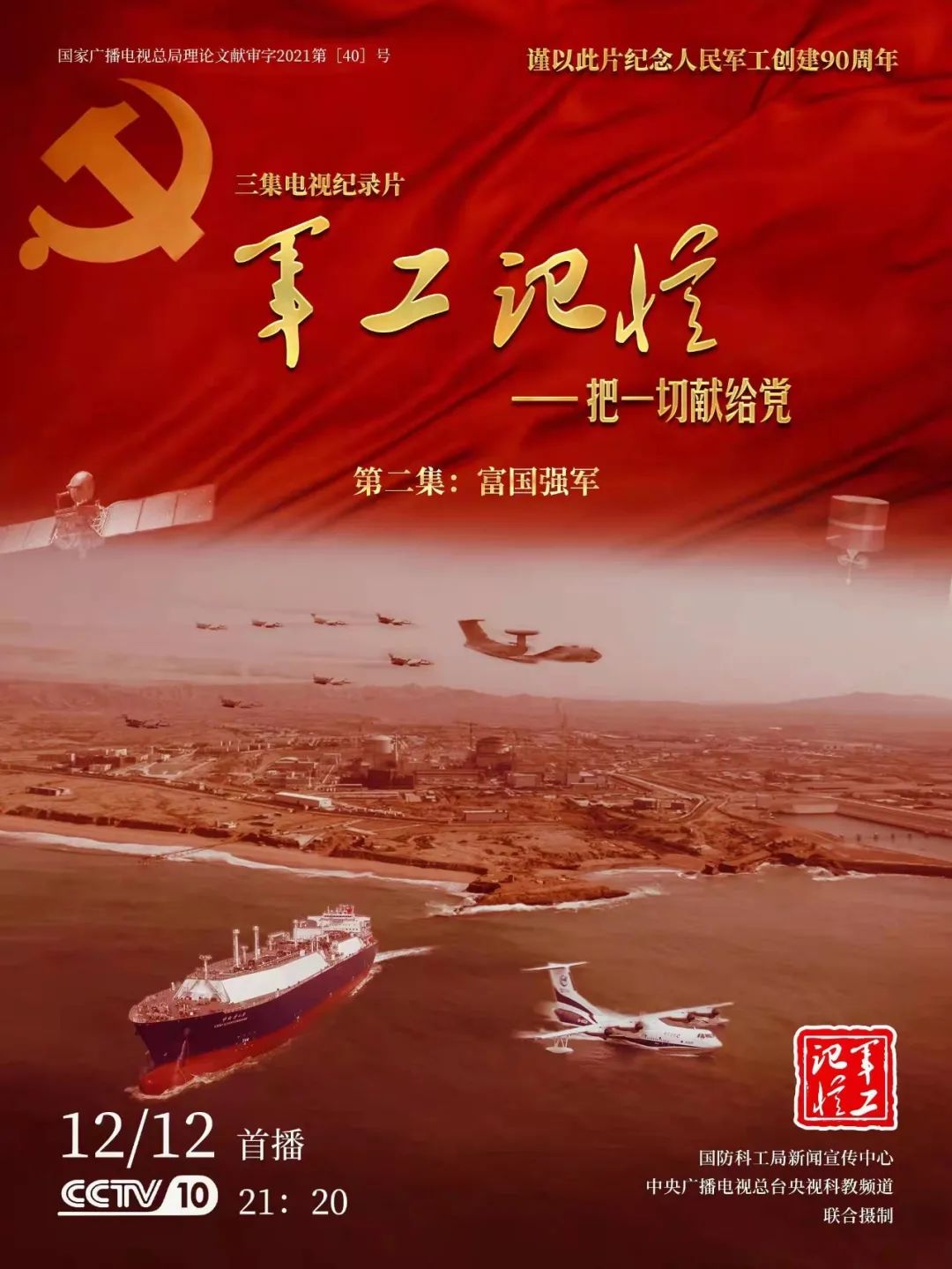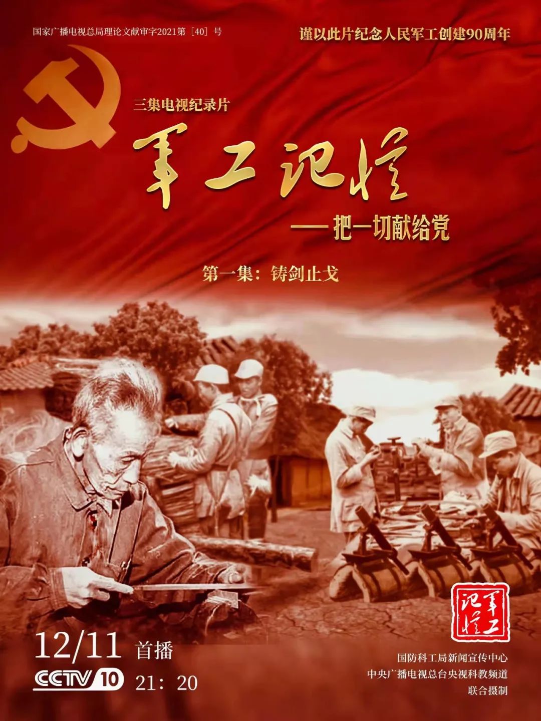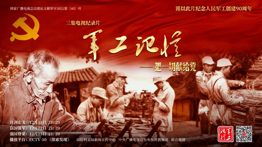 為慶祝中國共產(chǎn)黨成立100周年,紀念黨領(lǐng)導下的人民軍工創(chuàng)建90周年,由國防科工局指導,國防科工局新聞宣傳中心聯(lián)合中央廣播電視總臺社教節(jié)目中心攝制,各軍工集團大力支持的3集重大理論文獻電視紀錄片《軍工記憶——把一切獻給黨》,將于12月11日21:20在央視科教頻道(CCTV-10)《探索發(fā)現(xiàn)》欄目首播,連續(xù)播出3天。該紀錄片旨在向建黨百年獻禮,向人民軍工90周年致敬,向全社會弘揚軍工精神傳遞軍工文化,激勵國防科技工業(yè)戰(zhàn)線廣大干部職工不忘初心、接續(xù)奮斗,為實現(xiàn)強軍強國夢想貢獻力量。