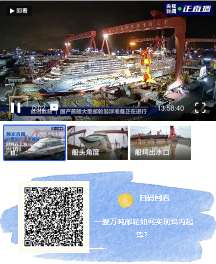 目前,船塢注水已經(jīng)結(jié)束,郵輪已經(jīng)起浮,將相繼實現(xiàn)起浮、移塢和出塢,您也可以掃描下方圖片中二維碼,一鍵直達(dá)直播現(xiàn)場。